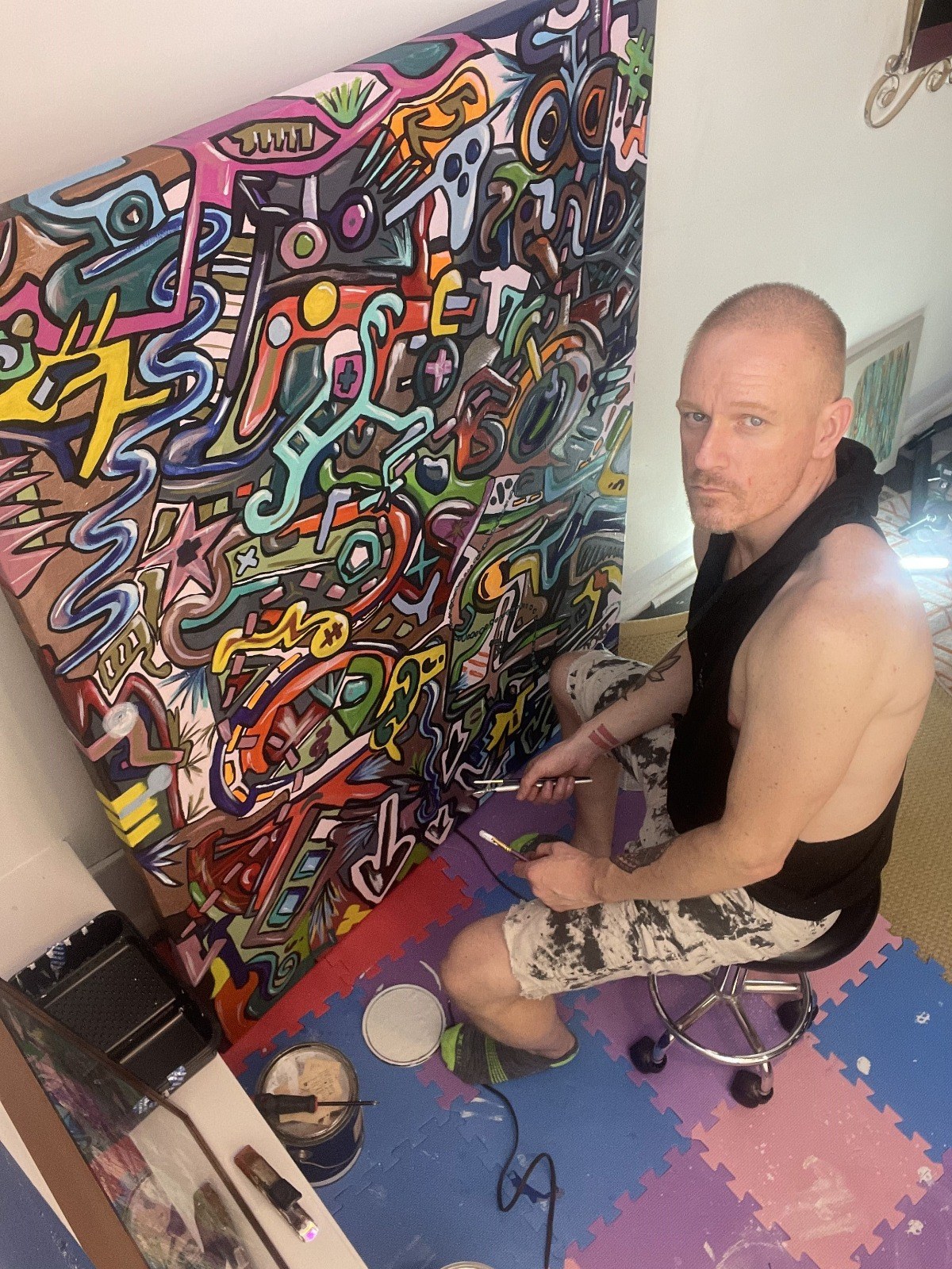My process is layered, messy, and full of contradictions—chaotic but searching for balance. Sometimes I rescue pieces I almost trashed. Painting helps me cope, reflect, and feel human. It’s survival, but with color.
